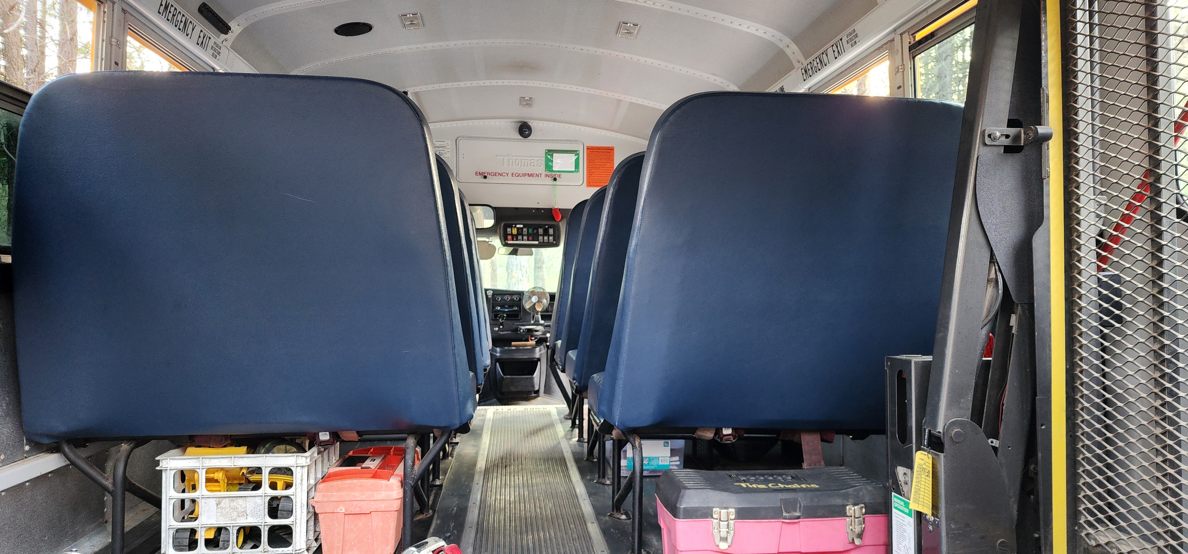 Hermi is a short school bus built on a van chassis, which makes him relatively easy to maneuver and park — but with all the added safety of a full-fledged school bus. We chose a bus because school buses are designed to meet the highest federal safety standards of any passenger vehicle. In fact, according to the National Highway Traffic Safety Administration, school buses — especially smaller ones like Hermi — are among the safest ways for children to travel.